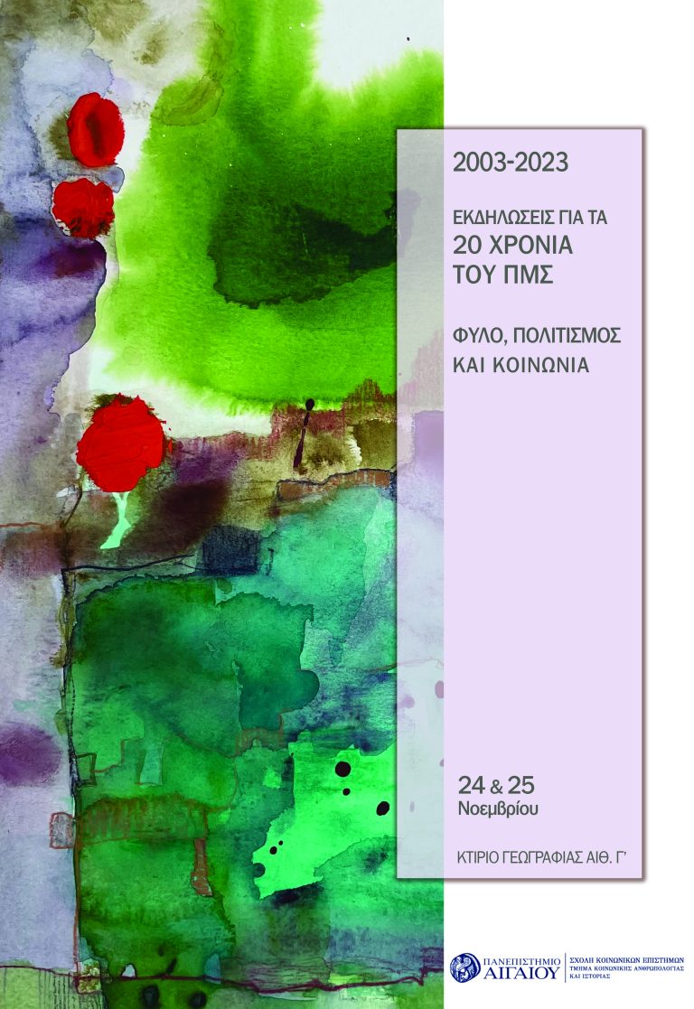 Το ΠΜΣ “Φύλο, Πολιτισμός και Κοινωνία” του Τμήματος Κοινωνικής Ανθρωπολογίας και Ιστορίας διοργανώνει στις 24 και 25 Νοεμβρίου 2023 διήμερο εκδηλώσεων, με δια ζώσης και εξ αποστάσεως παρακολούθηση, για να γιορτάσει τα 20 χρόνια λειτουργίας του.